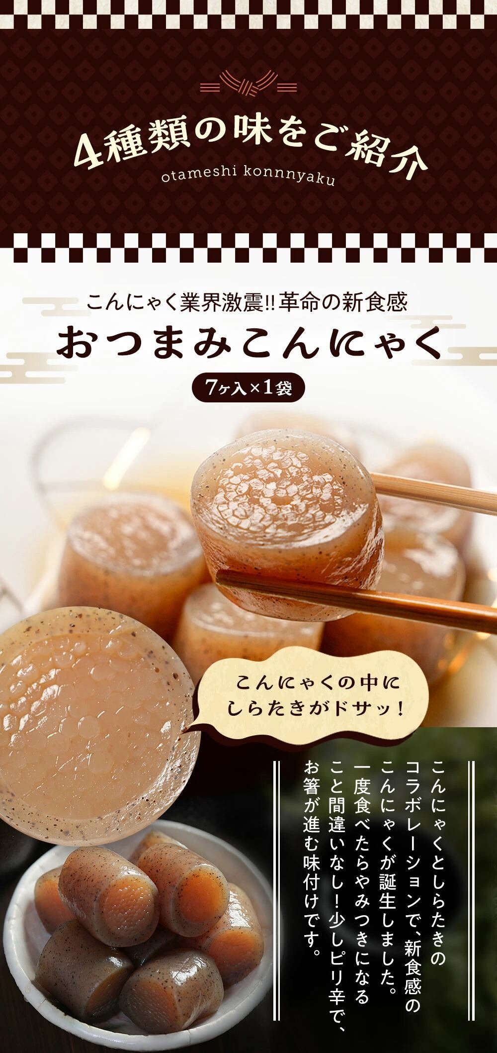 商品説明 :国産の原料を使用し、こんにゃく屋が食感にこだわり辿りついた新食感のおつまみこんにゃくです。